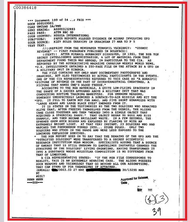 Серед документів розсекречених ЦРУ США є один, який містить шокуючи заяву про нібито атаку НЛО на радянські війська після того, як вони збили інопланетний корабель над військовою базою.