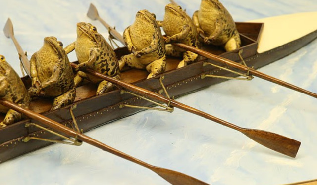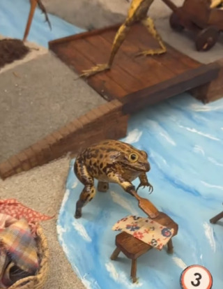 Жаби в музеї «ходять до школи», «працюють», «танцюють на вечірках» і навіть «грають на музичних інструментах».