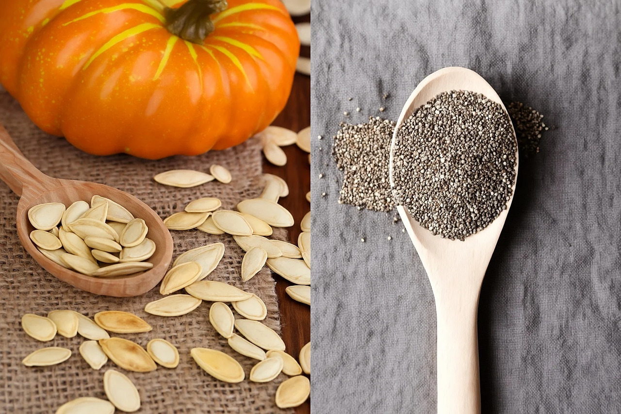 Гарбузове насіння та насіння чіа – обидва дуже корисні продукти. Вони багаті на білки, жири, мінерали та клітковину, тому добре підходять для здорового харчування.