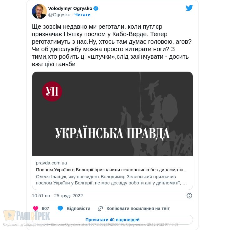 Інформацію про те, що новий посол у Болгарії не пов'язана з МЗС, «Європейській правді» підтвердили кілька джерел у дипкорпусі.