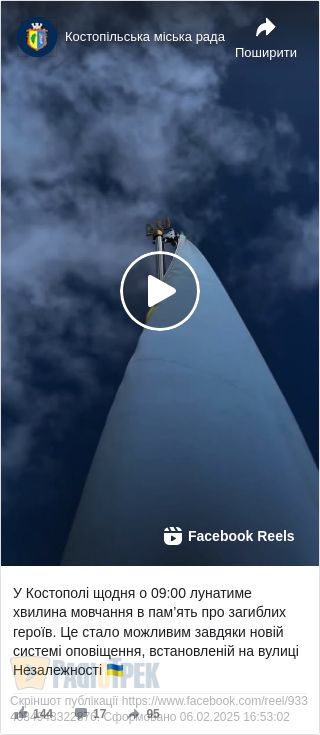 У центрі Костополя встановили нову систему оповіщення. Відтепер щоранку містян оповіщатимуть про загальнонаціональну хвилину мовчання в пам’ять про загиблих військових. В цей час люди чутимуть метроном.