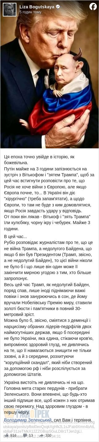 Можна було б, звісно, сміятися з деменції і нарцисизму обраних лідерів-пердофілів двох наймогутніших держав, якщо б посередині не було України, яка єдина, стікаючи кров'ю, випромінює здоровий глузд, не дивлячись на те, що її намагаються знищити не тільки ззовні, а й з середини, розхитуючи «корупційний скандал», який ніби створений за допомогою рф і ніби розслідується за допомогою Штатів.