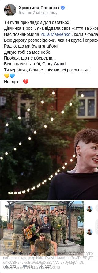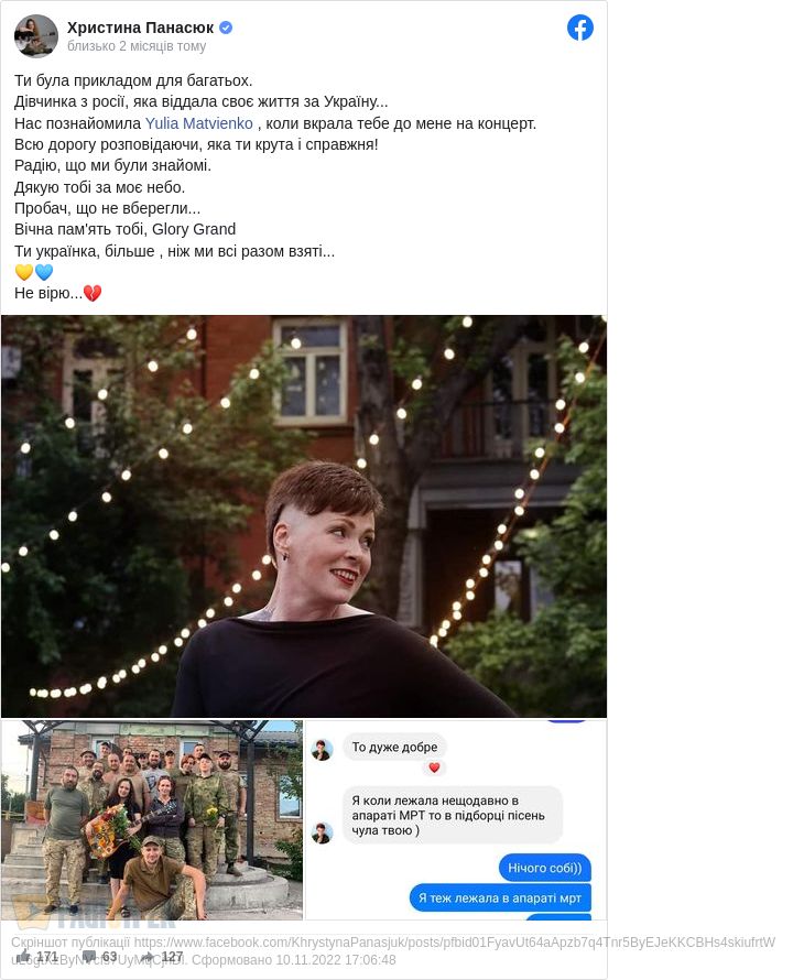 Glory Grand, що народилась у далекому Челябінську росіянкою і загинула українкою на Дикому полі, нехай янголи у вишиванках несуть на небо твою хоробру і чисту душу...
