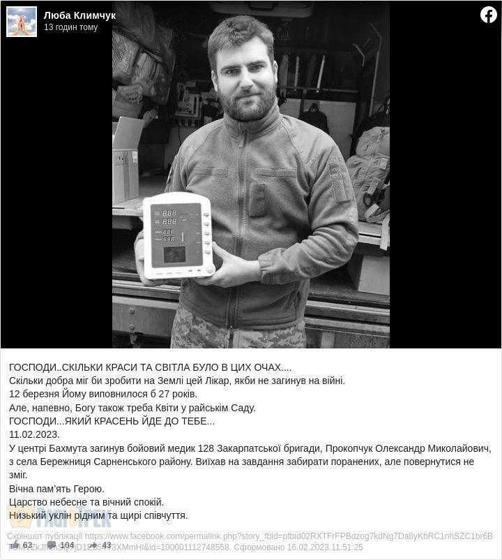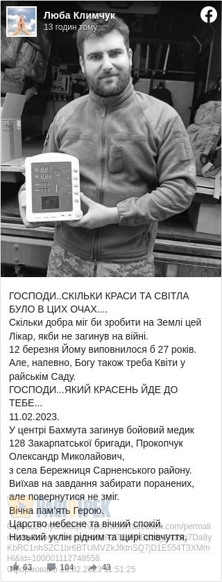 Під час виконання лікарського обов'язку на Бахмутському напрямку загинув Олександр Прокопчук з Рівненщини.