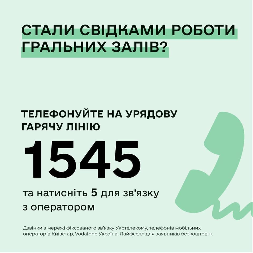 Тож, якщо ви стали свідками поновлення роботи гральних залів — звертайтесь на Урядову «гарячу лінію» за номером 1545 (для з’єднання з оператором потрібно натиснути «5»).