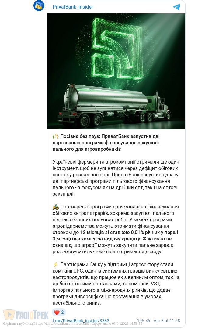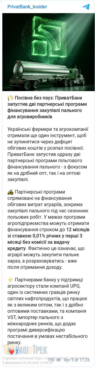 ПриватБанк розповів, як фермери можуть отримати гроші на пальне для посівної. Банк запустив дві партнерські програми фінансування бензину та дизеля для агровиробників – як для дрібних, так і для великих закупівель.