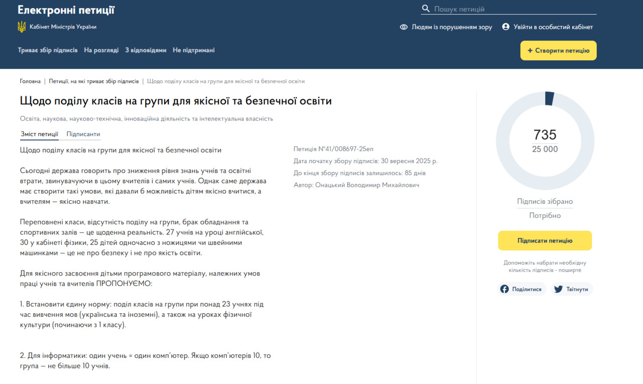На сайті Кабміну з’явилася петиція, де просять встановити чіткі норми та виділити кошти на поділ класів. Автор петиції, Володимир Онацький, каже, що зараз у класах часто неможливо нормально вчитися: 27 учнів на уроці англійської, 30 у кабінеті фізики, десятки дітей одночасно з ножицями чи швейними машинками.