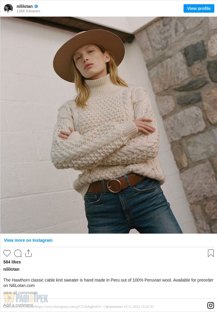Свою любов до в’язаних речей Нілі Лотан майстрині пояснюють акцентом на натуральність та практичність. Речі справді цінні, адже вони переважно з вовни, кашеміру, ніжного мериноса та шовку.