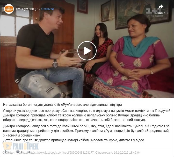 Якщо ви дивилися «Світ навиворіт» із Дмитром Комаровим, то бачили, що практично завжди, коли він у своїх випусках пригощав когось десь хлібом з України, то це був хліб від торгової марки «Рум'янець».