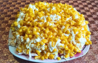 Для святкової подачі викладіть шарами: рис, крабові палички, кукурудза, яйця, злегка промащуючи майонезом. Прикрасьте зеленню або сиром.