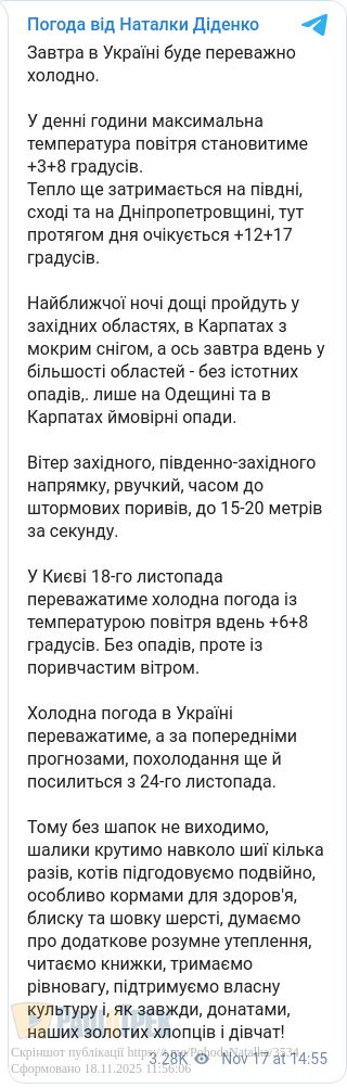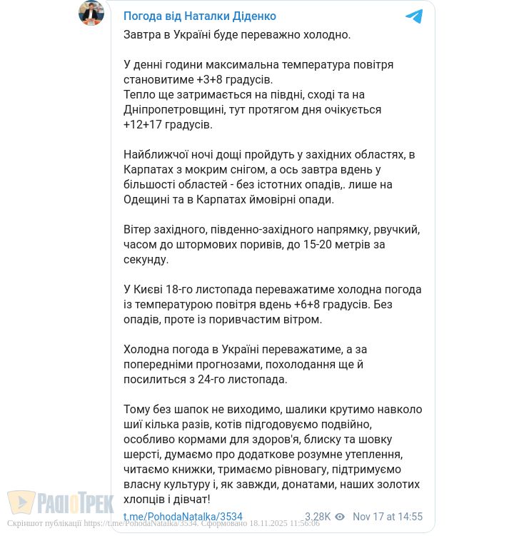 Завтра, 19 листопада, в Україні буде переважно холодно. Вдень максимальна температура повітря становитиме +3...+8 градусів, повідомила синоптик Наталка Діденко.