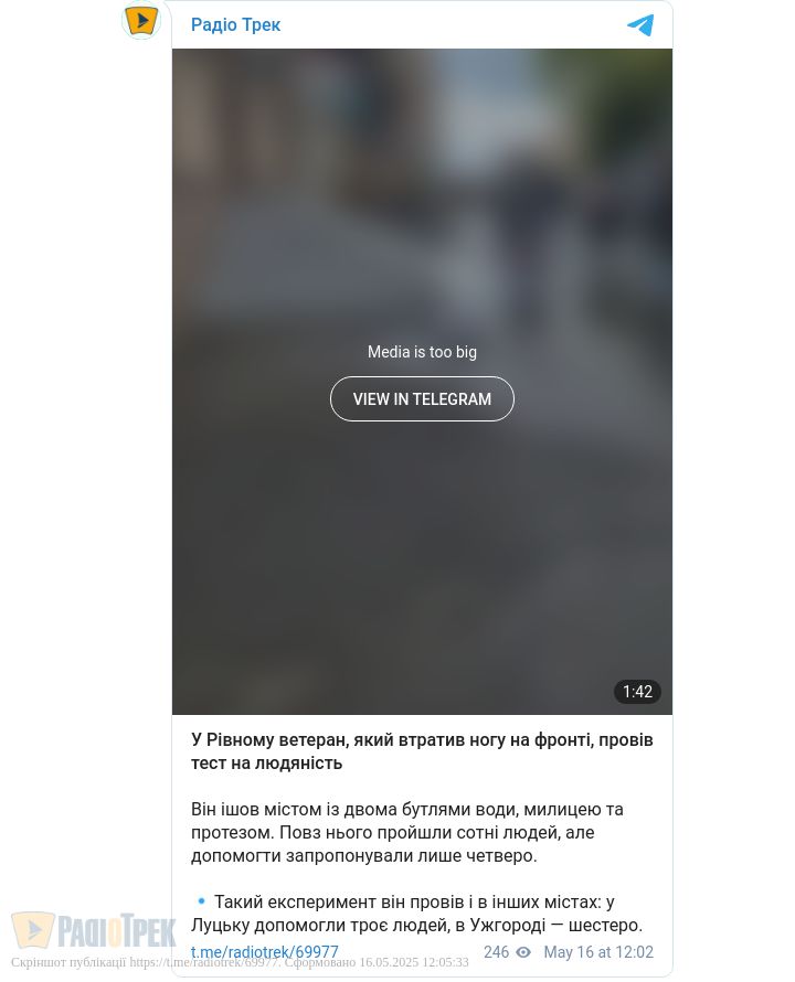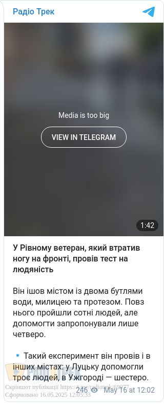 Тест на людяність провів ветеран у Рівному. Євген Сивопляс, який втратив на війні ногу і використовує протез, у центрі міста йшов із двома бутлями води. Окрім цього в одній руці він ніс милицю.