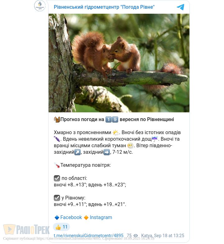 - у Рівному: вночі +9…+11°, вдень +19…+21°.