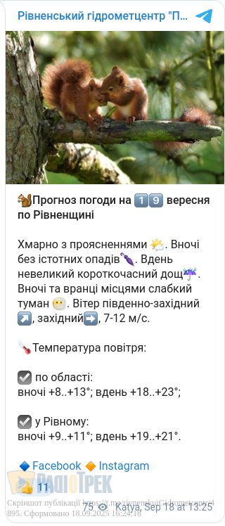 У четвер, 19 вересня, на Рівненщині буде хмарно з проясненнями. Вночі – без істотних опадів, а вдень можливий невеликий короткочасний дощ.