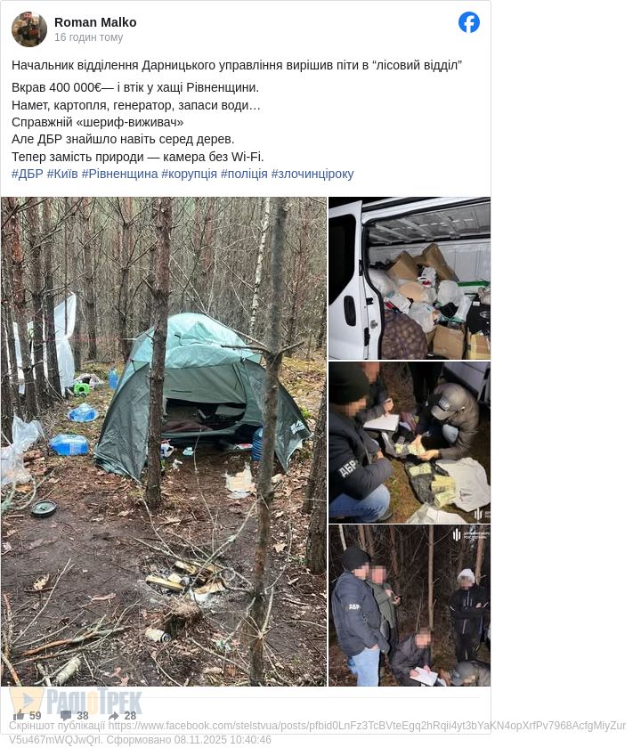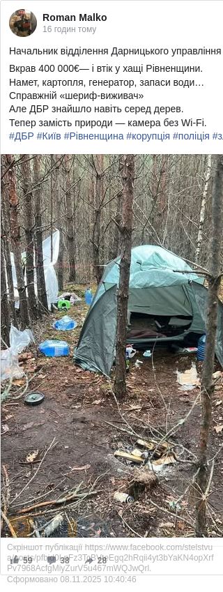 Через три дні – 6 листопада, працівники ДБР та поліції встановили місце перебування чоловіка — він переховувався у лісі на Рівненщині, де облаштував тимчасове житло.