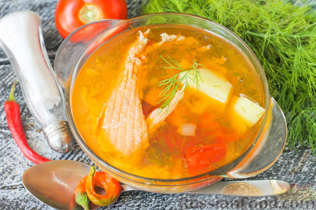 Хребти проварити у воді 20 хвилин, зняти піну. Додати овочі та варити ще 15 хвилин. Потім дістати рибу, відокремити м’ясо і повернути в каструлю. В кінці додати кріп. За бажанням можна додати трохи вершків.