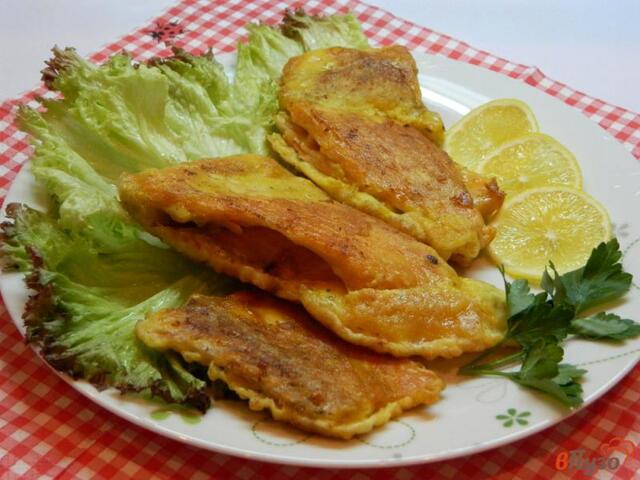 Рибу порізати, приправити і збризнути лимоном. Змішати яйця, борошно і воду — зробити кляр. Обваляти шматки риби в клярі і обсмажити на сковороді до золотистої скоринки.