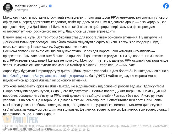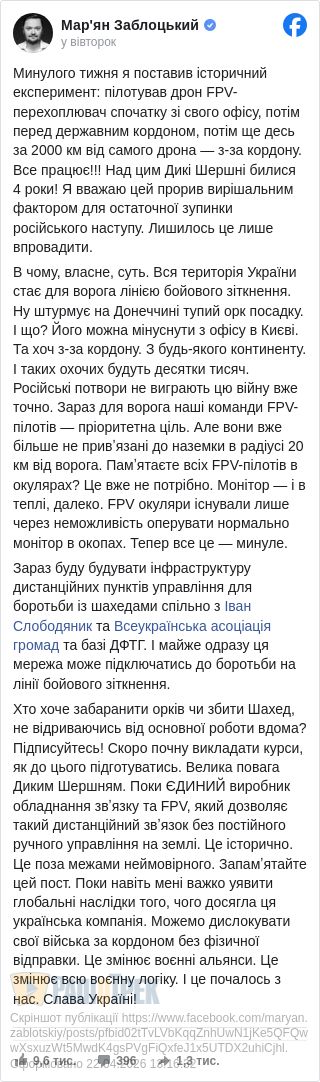 Maryan Zablotskiy- Минулого тижня я поставив історичний експеримент: пілотував дрон FPV-перехоплювач спочатку зі свого офісу, потім перед державним кордоном, потім ще десь за 2000 км від самого дрона — з-за кордону.