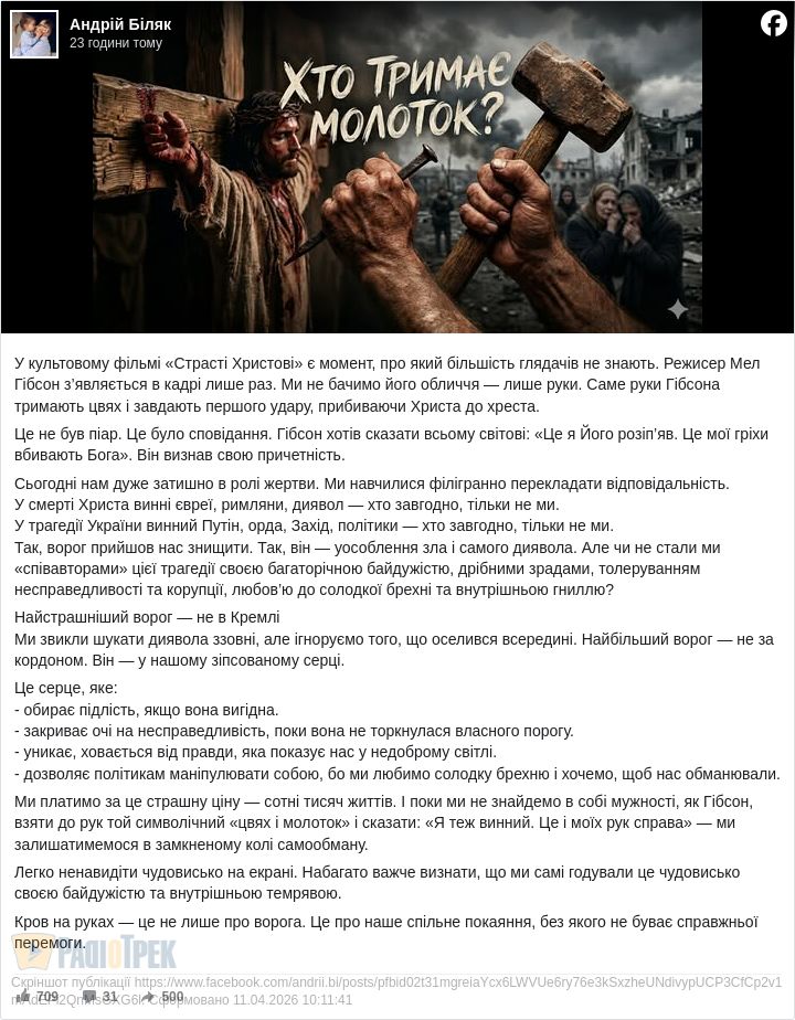 Так, ворог прийшов нас знищити. Так, він — уособлення зла і самого диявола. Але чи не стали ми «співавторами» цієї трагедії своєю багаторічною байдужістю, дрібними зрадами, толеруванням несправедливості та корупції, любов’ю до солодкої брехні та внутрішньою гниллю?