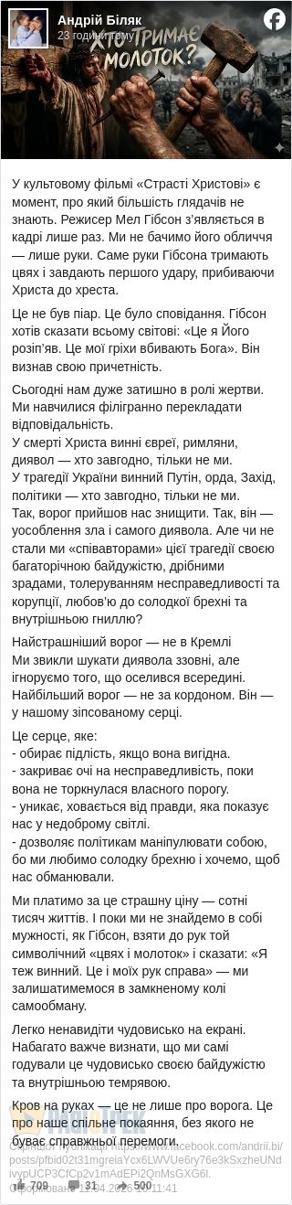 Це не був піар. Це було сповідання. Гібсон хотів сказати всьому світові: «Це я Його розіп’яв. Це мої гріхи вбивають Бога». Він визнав свою причетність.