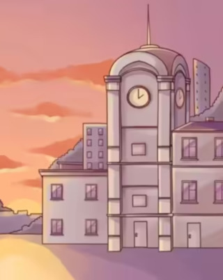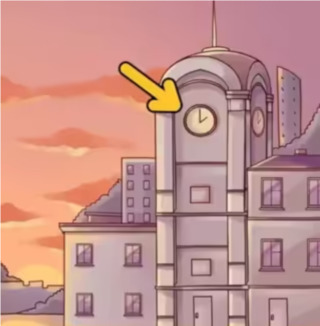 Годинник на вежі показує другу годину, однак цього не може бути, бо на зображенні показано захід сонця і вечірню пору.