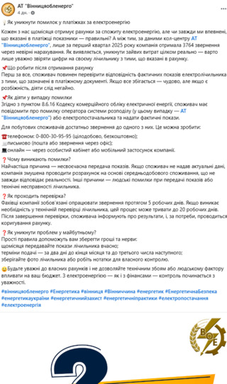 За даними АТ «Вінницяобленерго», лише за перші три місяці 2025 року компанія опрацювала 3764 звернення від споживачів, які повідомили про неправильні нарахування у квитанціях. Основні причини таких збоїв: