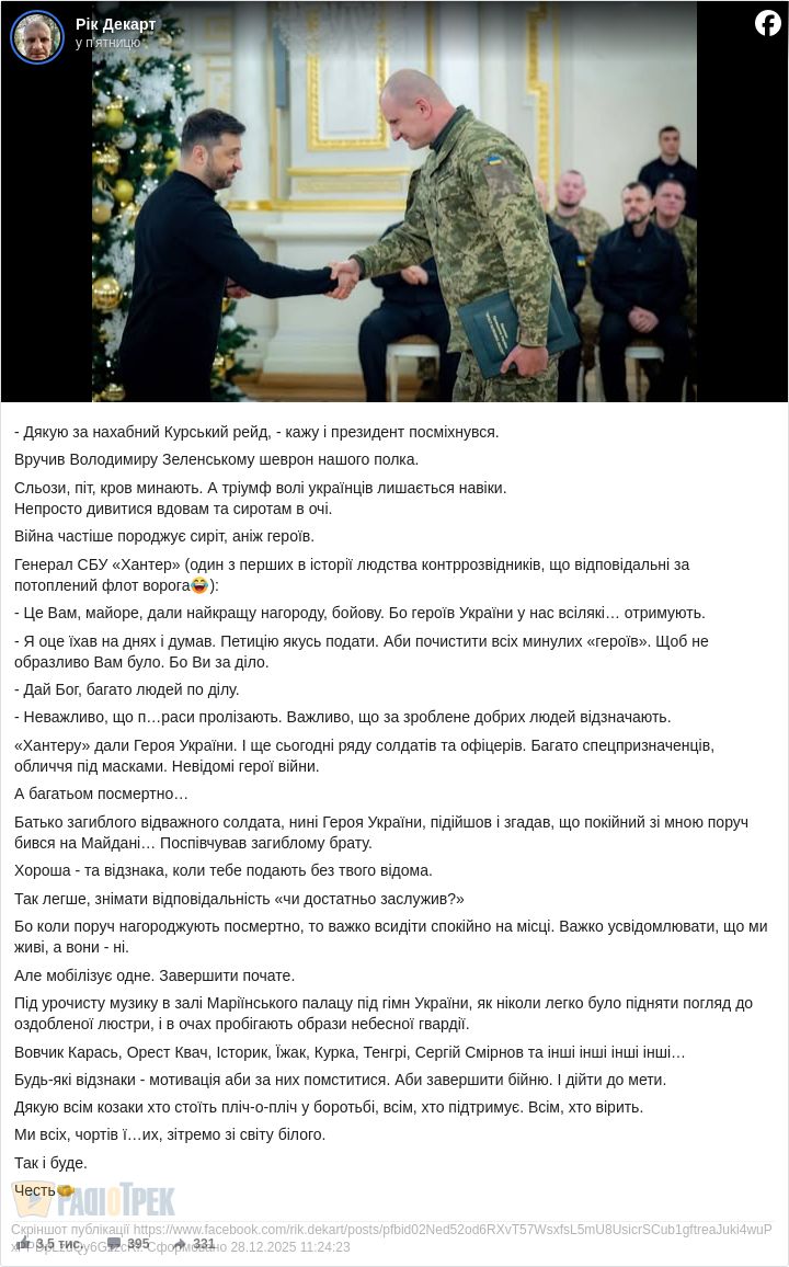 «Хантеру» дали Героя України. І ще сьогодні ряду солдатів та офіцерів. Багато спецпризначенців, обличчя під масками.