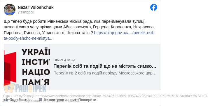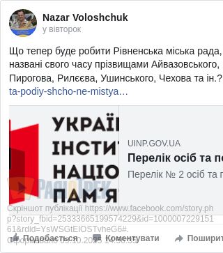 - Що тепер буде робити Рівненська міська рада, яка перейменувала вулиці, названі свого часу прізвищами Айвазовського, Герцена, Короленка, Некрасова, Пирогова, Рилєєва, Ушинського, Чехова та ін.?
