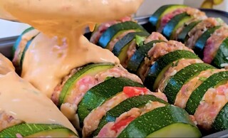 Полити кабачки соусом. Посипати тертим сиром. Запікати в духовці за температури 180 °C протягом 40–60 хвилин до готовності овочів і рум’яної скоринки.