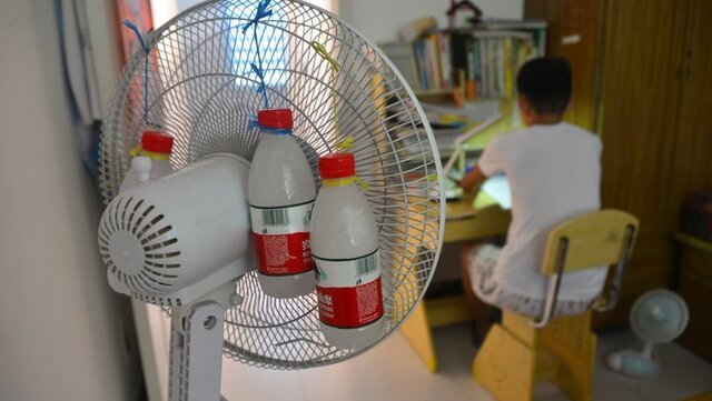Поставте миску з льодом або заморожену пляшку перед вентилятором — так повітря в кімнаті стане прохолоднішим. Якщо посолити лід — він танутиме швидше, і ефект буде сильнішим.