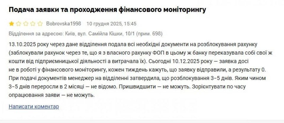 Однак станом на 10 грудня рахунок так і не розблокували. Жінка стверджує, що документи досі не розглядає фінансовий моніторинг, а кожне звернення до банку завершується формальними відповідями без результату.