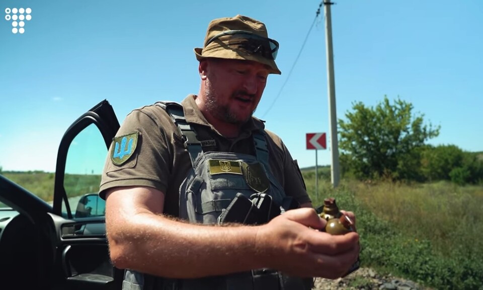 «Це — оборонна граната, а це — наступальна. Їх придумали 100 років тому. А це (показує військовий на третю) — сучасна історія».