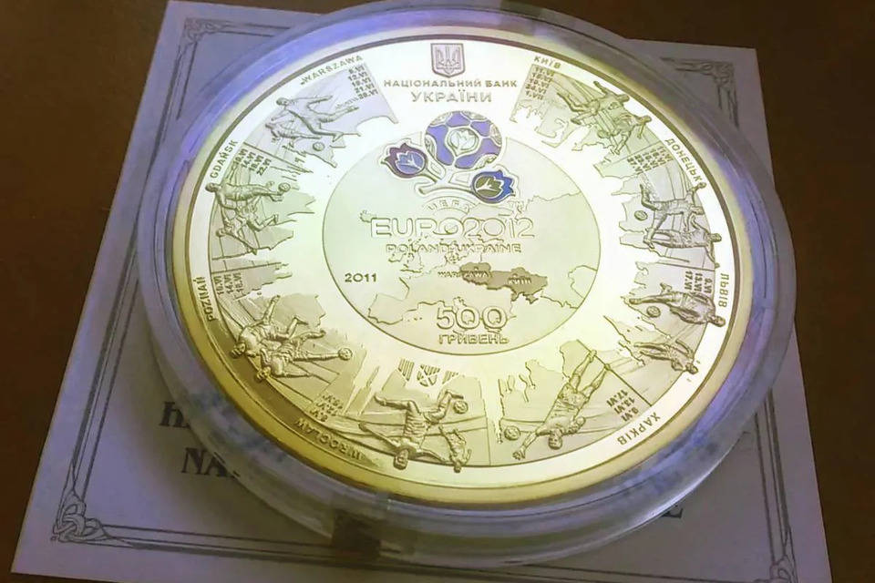 Найдорожчу українську монету виготовив Монетний двір НБУ у 2012 році. Вона присвячена фінальній частині чемпіонату Європи з футболу Євро-2012 та має назву «Фінальний турнір чемпіонату Європи з футболу 2012 року».