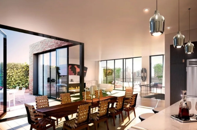Дуплекс має чотири спальні, кожна з яких із власною ванною кімнатою. Поверхи з’єднані сходами з білого дуба та скла.