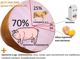 Правильний склад "Докторської ковбаси" - це м'ясна сировина 95% (напівжирна свинина і яловичина). Також продукт включає яєчні компоненти (яйця або частіше меланж), сухе молоко, сіль і цукор, спеції і нітрит натрію для гарного кольору.