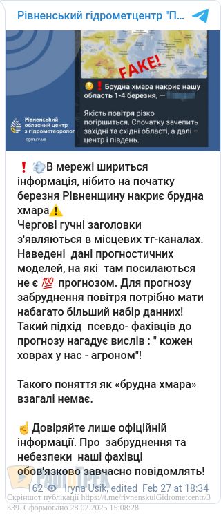 Рівненські синоптики закликають жителів краю не довіряти неофіційним джерелам. Адже наведені дані прогностичних моделей не є точним прогнозом. Більше того такого поняття як «брудна хмара» – не існує.