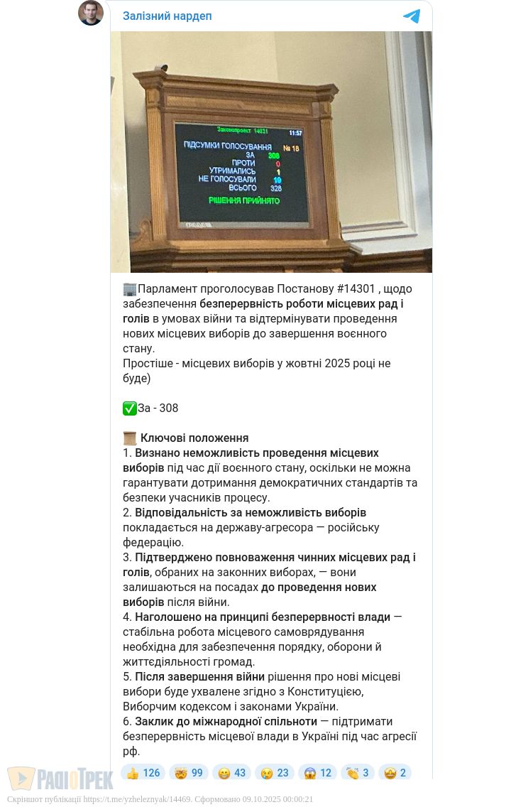 Парламент України поставив крапку в питанні проведення виборів у період воєнного стану. Верховна Рада підтвердила неможливість проведення місцевих виборів під час війни та ухвалила Постанову №14301, якою гарантується безперервність роботи чинних місцевих рад і голів громад, пише Стіна.
