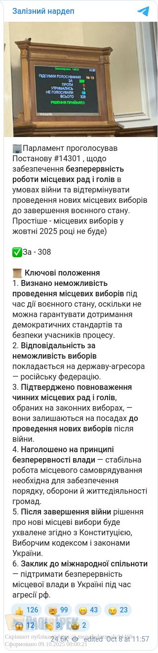 Український парламент звернувся до міжнародної спільноти із проханням підтримати рішення щодо безперервності місцевого самоврядування. У документі наголошено, що в умовах постійних ракетних атак, окупацій і евакуацій виборчий процес неможливо провести без ризику для життя людей.