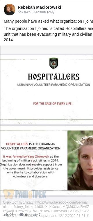 Зазначимо, що Ребека Мацировська прибула в Україну ще на початку повномасштабної війни в Україні та одразу вступила до лав медичного добровольчого батальйону «Госпітальєри», який з 2014 року займається евакуацією військових та цивільних жертв з фронту.