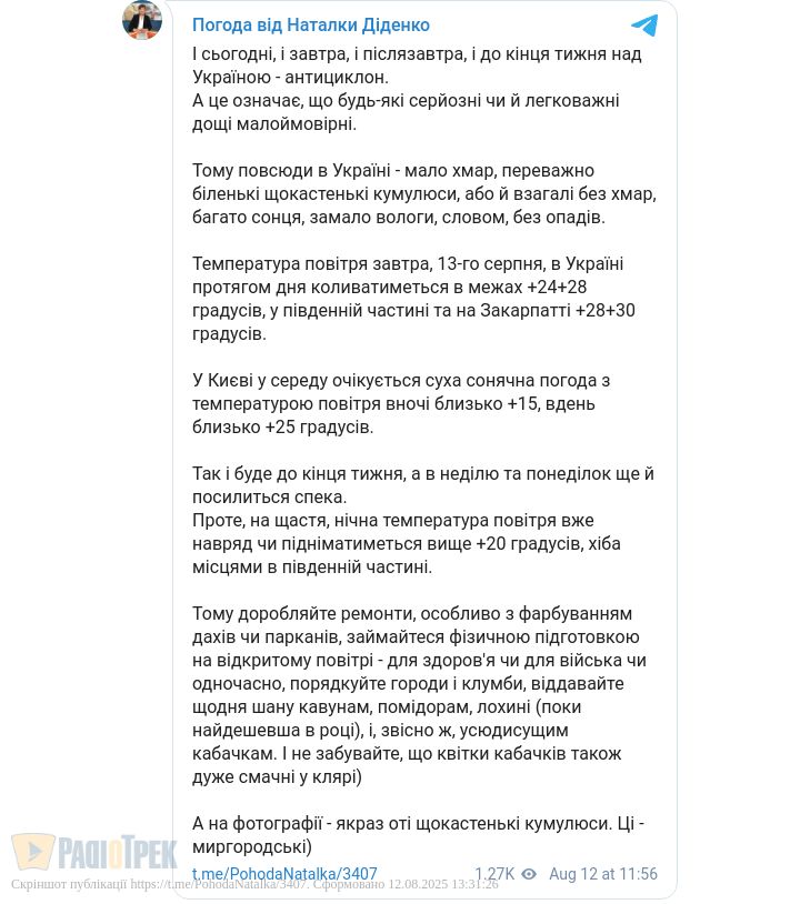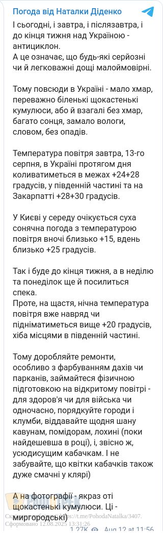 Через це повсюди буде мало хмар, багато сонця, а також буде без опадів, повідомила синоптик Наталка Діденко.