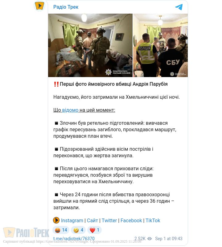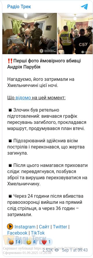 МВС звітує про швидке розкриття справи, виявлення та затримання – можливого вбивці Андрія Парубія.