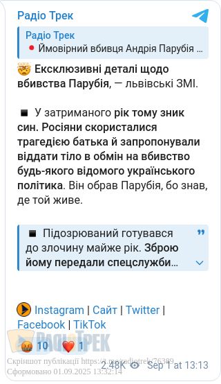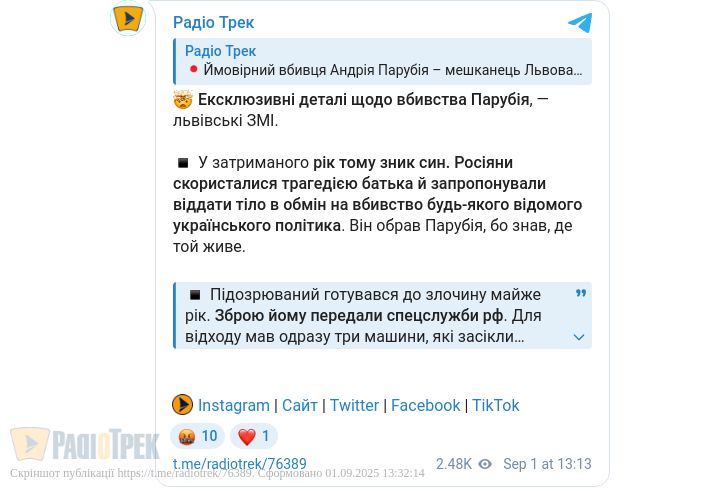 1 вересня, керівник Львівської обласної прокуратури Микола Мерет підписав підозру 52-річному львів'янину, якого затримали у справі про вбивство Андрія Парубія.