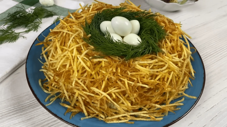 У центрі зробіть заглиблення з тертого жовтка, по краях викладіть хрумку картоплю, формуючи «гніздо». Прикрасьте кропом і викладіть всередину перепелині яйця.