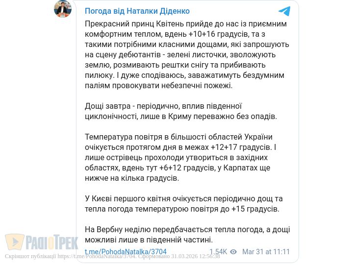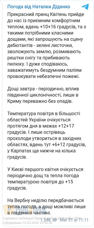 У більшості областей завтра, 1 квітня, очікується до +12...+17 градусів, повідомила синоптик Наталка Діденко.