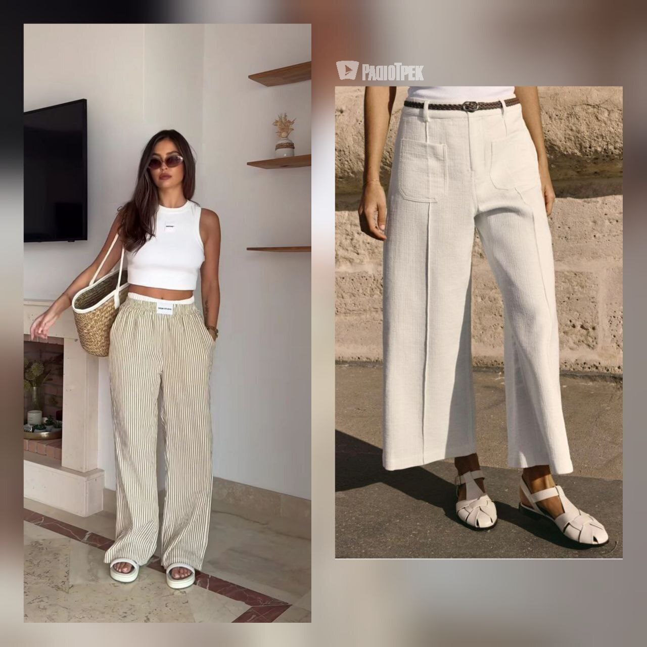 Льон — ідеальна тканина для спеки. Широкі лляні штани у 2025 році найчастіше мають класичний прямий крій або комфортні складки тканини на талії. Кольори — ніжні й нейтральні: білий, пісочний, світло-сірий, а також пастельні акценти, як світло-блакитний чи зелений. Вони бездоганно комбінуються з футболками, лляними сорочками та топами, утворюючи ідеальний літній ансамбль.