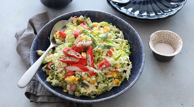 Заправити салат майонезом або грецьким йогуртом, перемішати. За смаком салат підсолити та додати кропу.
