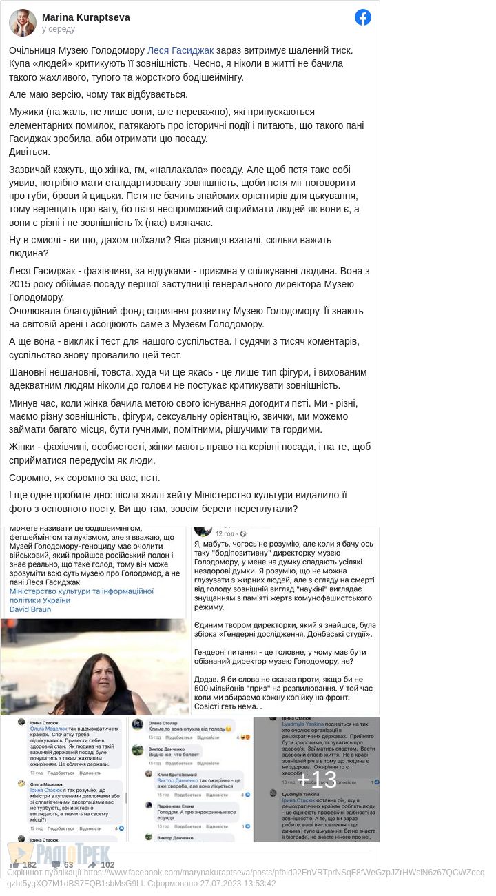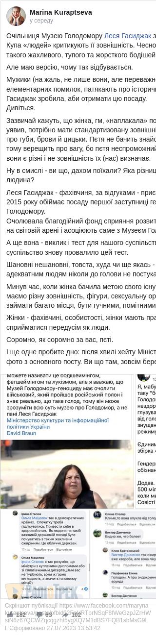 Усе почалося із посту юриста Клима Братківського, який написав на своїй сторінці у Facebook, що Леся Гасиджак не може очолювати музей Голодомору, бо нібито має невідповідну зовнішність.