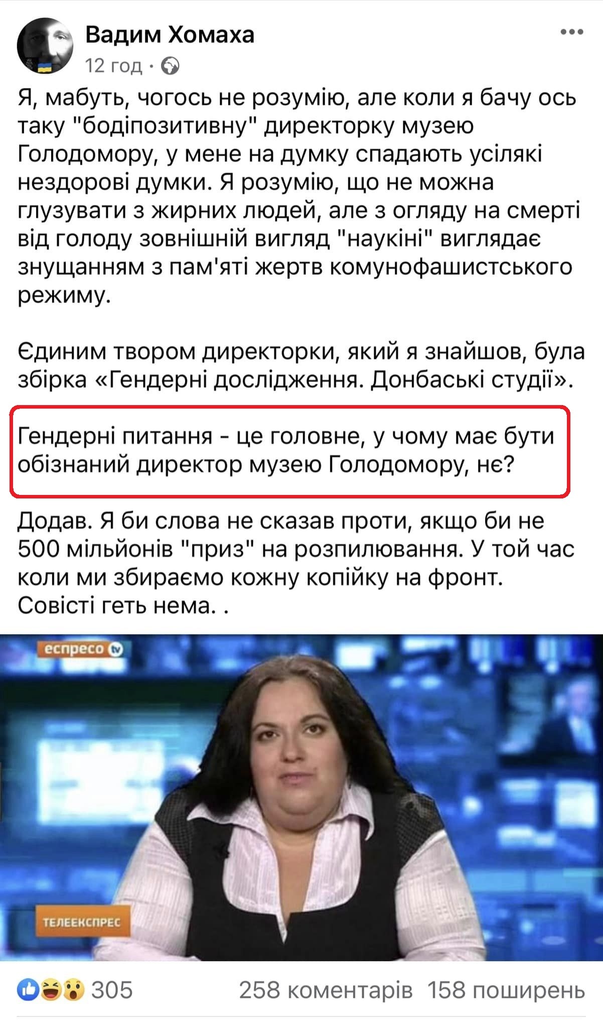 Нині у центрі уваги питання т.з. «бодішеймінгу» стосовно людини, яка уособлює сам цей музей Голодомору, що жде – не діждеться непомірних бюджетних вливань прямо посеред Війни. Як пише, зокрема, Суспільне...