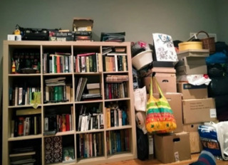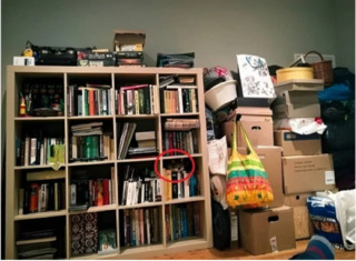 На зображенні видно полиці, заставлені книжками, коробки та інші дрібниці. На перший погляд здається, що там немає нічого живого — лише звичайні речі, однак це зовсім не так.