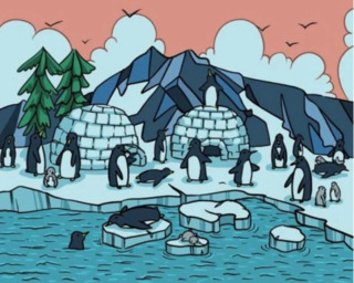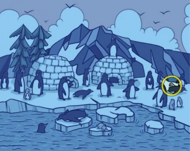 Якщо не вдалося знайти тюленя за відведений час – ось підказка: зверніть увагу на правий бік картинки. Тюлень заховався за одним із пінгвінів.